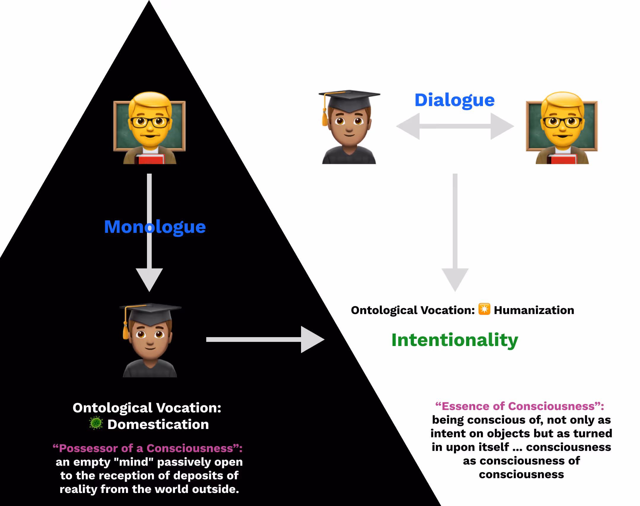 The latter half of Chapter 1 will focus on Problem-posing education as a solution to the banking model's contradiction between teacher and student. Before that, a minor sidebar on educational neuroscience that Freire puts forward that contrasts directly with banking, "Liberating education consists in acts of cognition, not transferrals of information." The connection between cognitive development and oppression certainly informs how we perceive the world, as Freire has cautiously spells out in both chapters, yet it is one of the earlier mentions of how 'cognizable objects' act as intermediaries for knowledge acquisition. Going back to previous lessons on comparative religious mythology, Marshall McLuhan's application Tetrad of Media Effects was not limited to metaphysical analysis of television and radio, but also of social objects (about 50 are indexed in The Medium is the Massage) like equilibrium, visual space, cash money, credit, pensions. The book is worth checking out for their blurbs of analysis that capture Freire's perspective so acutely. Cognizable objects are social mediums that we experience, reflect, and learn from. School, education, student, books - all are meta-cognized names we give to forms of human activity. The simplest formula to follow and understand this notion is Consciousness + Object = Experience. Hence the significant link between the cognized dialogue of student and teacher with Freire's critical consciousness.
